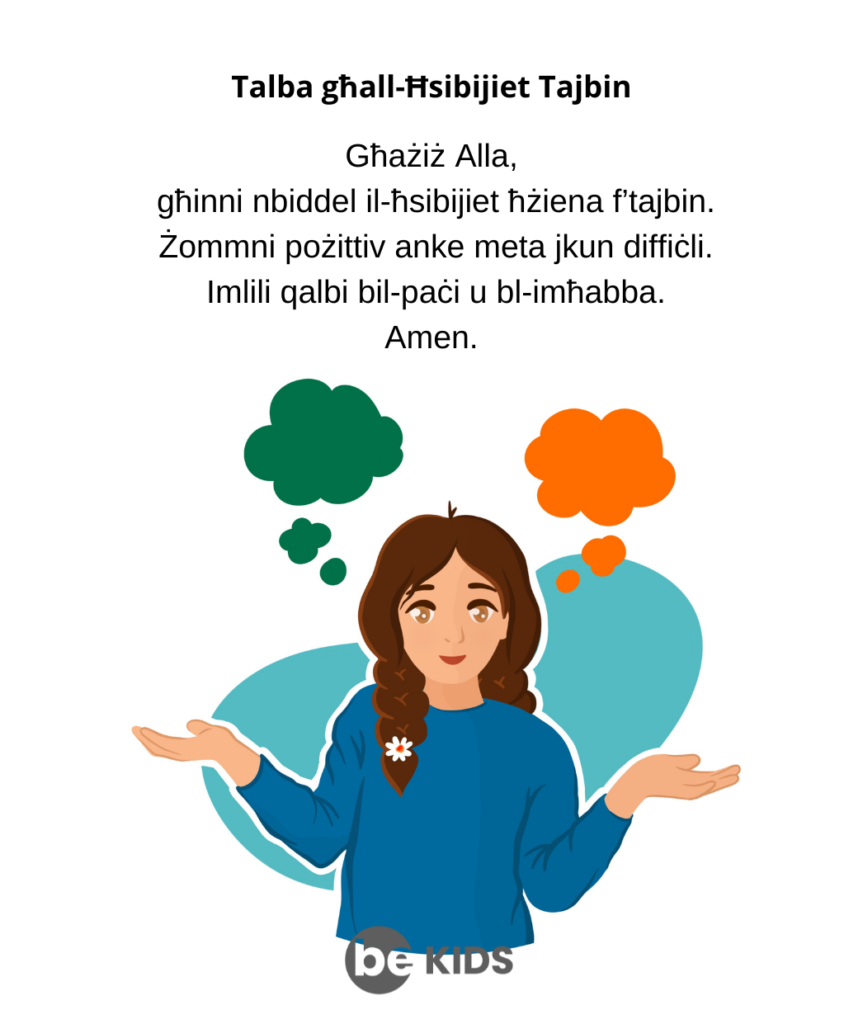 Għid jew ikteb talba biex Alla jgħinek tħares u taħseb b’mod iktar pożittiv fil-ħajja.