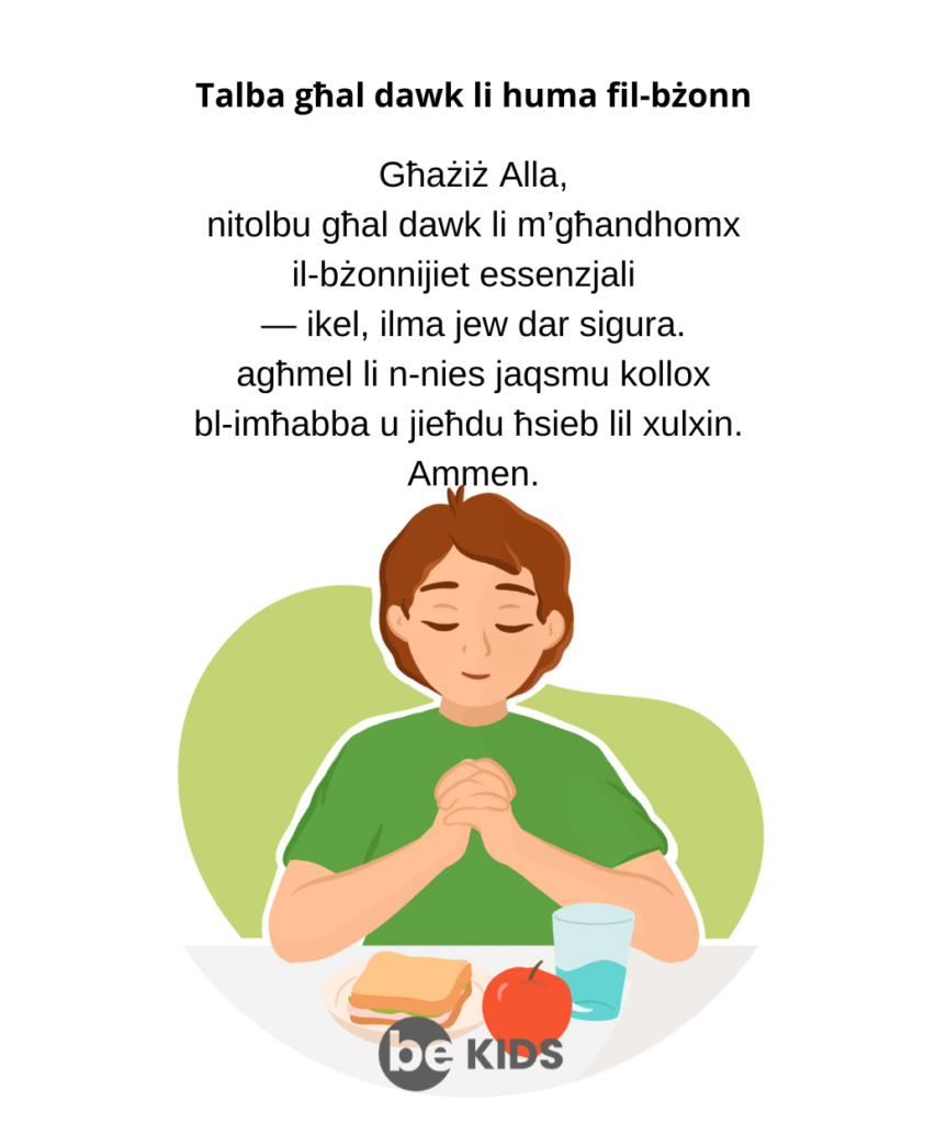- Matul din il-ġimgħa, ta’ kuljum, għid talba għal kull min hu nieqes mill-bżonnijiet essenzjali u itlob għan-nies madwar id-dinja biex niftħu iżjed qalbna għall-bżonnijiet ta’ xulxin.