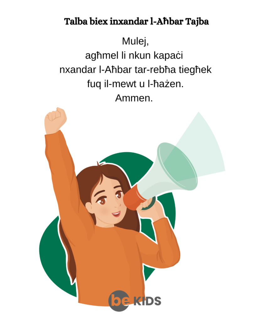 ➢ Għaddi ftit ma’ Ġesù u itolbu sabiex jagħtik il-kuraġġ biex twassal l-Aħbar tiegħu lil kulħadd permezz ta’ dak li taħseb, tgħid u tagħmel.